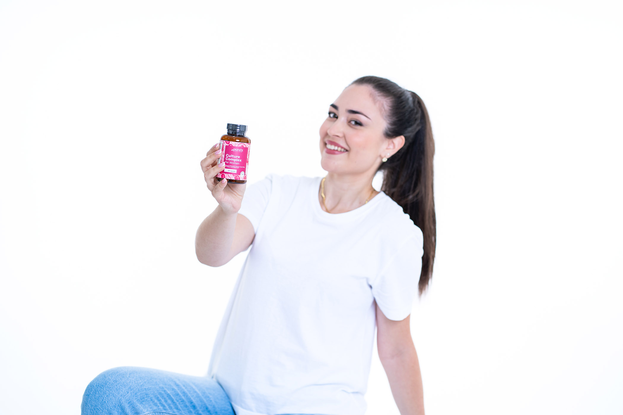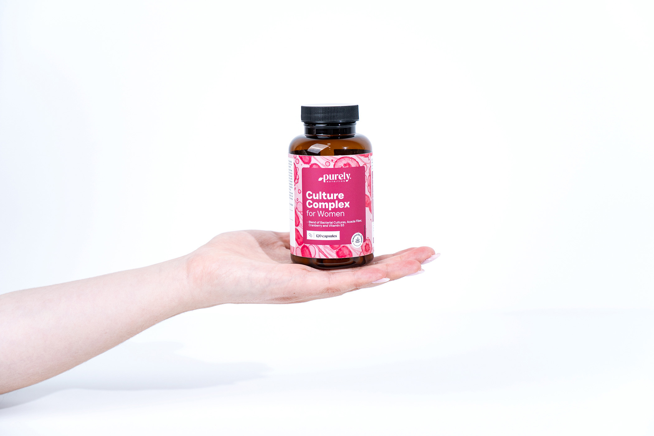 Ingrediente: fibre de salcâm, agent de umplere: celuloză, hidroxipropilmetilceluloză (HPMC; înveliș vegetal al capsulei), extract uscat de merișoare ( Vaccinium macrocarpon ; fruct; standardizat la 50% proantocianidine), agent antiaglomerant: săruri de magneziu ale acizilor grași, niacină (vitamina B3), mix de culturi bacteriene 500 miliarde / g ( Lactobacillus acidophilus, Lactobacillus casei, Lactobacillus crispatus, Lactobacillus gasseri, Lactobacillus plantarum, Lactobacillus rhamnosus ).